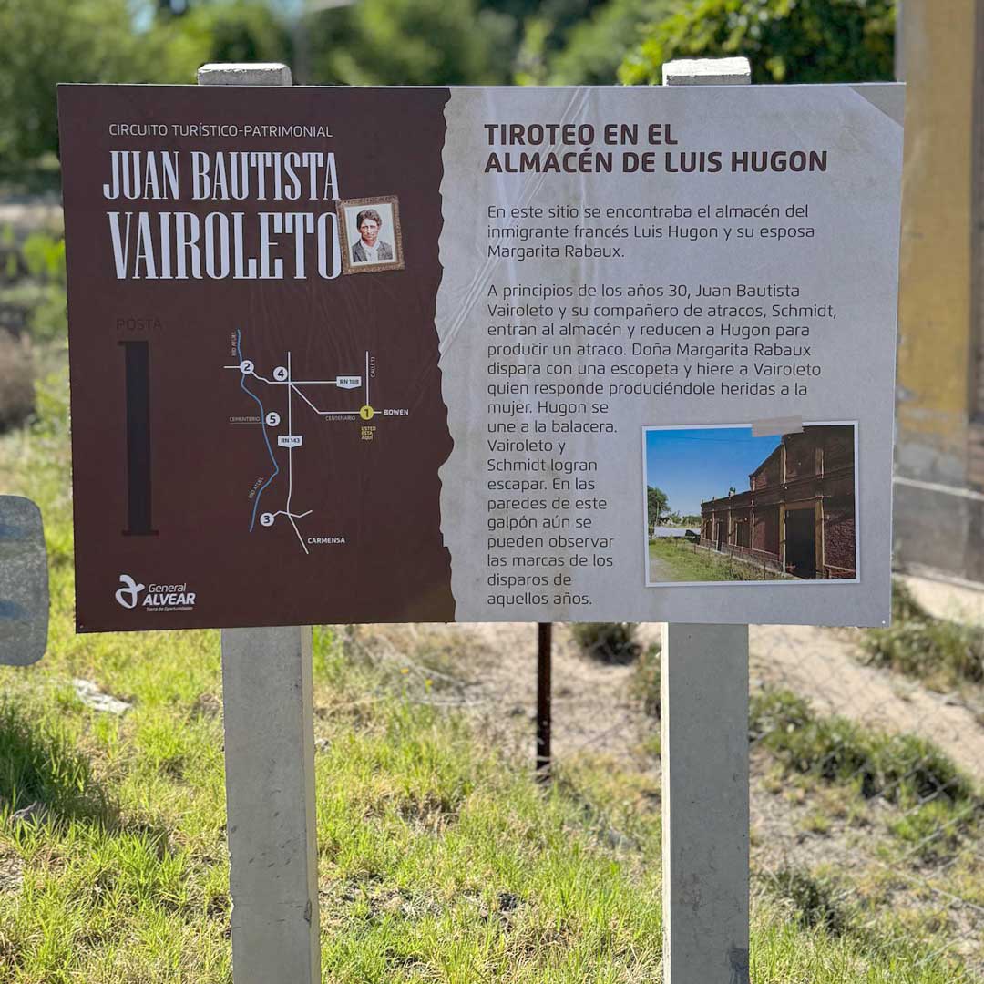 Allí, en lo que hoy es un galpón tranquilo, hubo una balacera que casi acaba con su vida. Margarita, la dueña del almacén, le disparó con una escopeta. Vairoleto respondió… y huyó. En las paredes, todavía se ven las marcas de esos tiros. Como cicatrices del pasado.